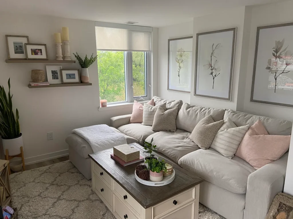 The whole room speaks in soft pinks, warm neutrals, and cream — and the shelves carry that same palette. Nothing clashes. Nothing shouts. The large botanical prints on the adjacent wall echo the plant on the shelf, creating a thread of greenery that ties the space together. The candles add warmth and height without adding clutter. And the personal photos are what make the room feel truly lived in and loved.