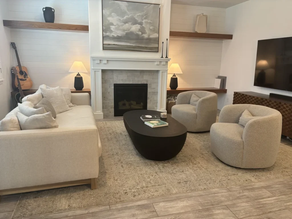 One thing worth noting: when you have statement architecture like this, your shelf decor doesn’t need to shout. Let the room’s bones do the work. Keep items varied in height and texture — a mix of books stacked vertically and horizontally, a few sculptural pieces, trailing greenery — and resist the urge to fill every inch. The negative space around your objects is part of the display.
