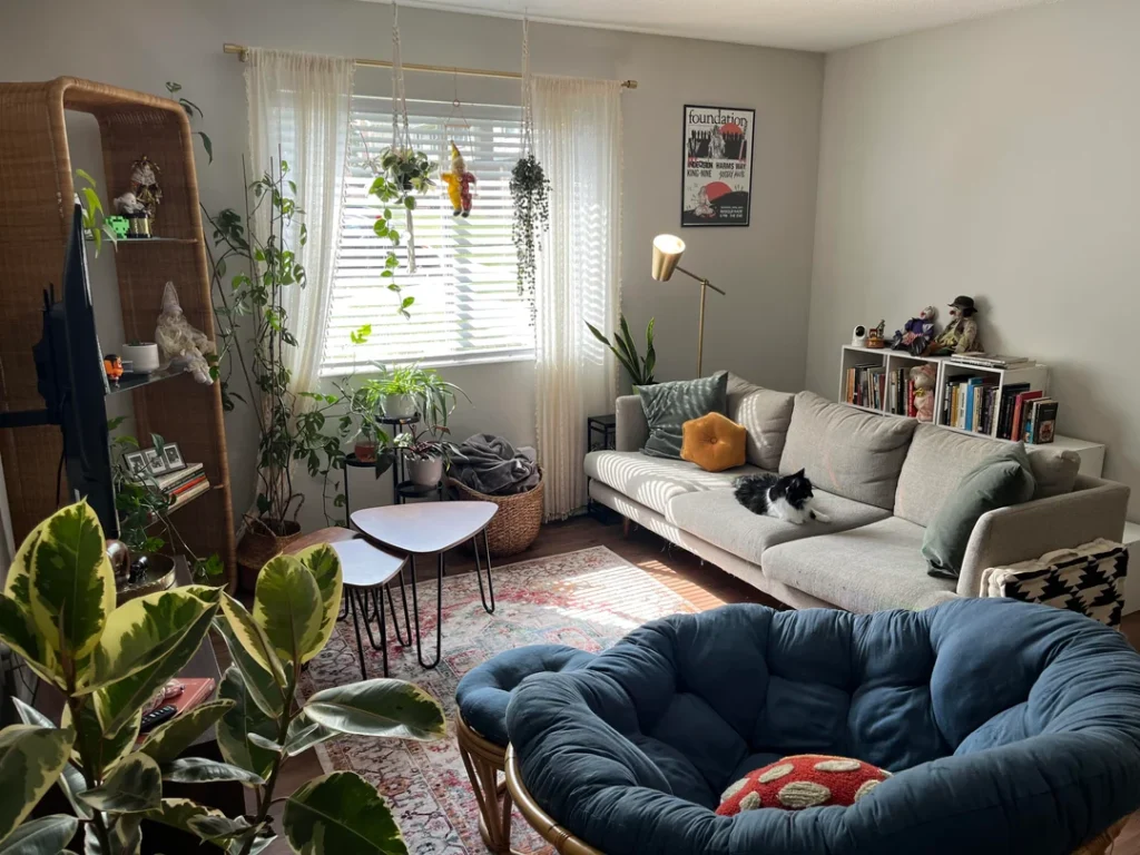 The rattan shelf holds crystals, books, photographs, and random curiosities. The bookcase is stacked with books and topped with small figures. Hanging plants trail from the curtain rod. Rubber plants and fiddle leaf figs claim the floor. A concert poster sits on the wall. A cat sleeps on the couch. It is, genuinely, a lot — and it works because there’s a warmth and coherence to the palette. Greens, naturals, warm woods, and muted tones tie everything together underneath the apparent chaos.