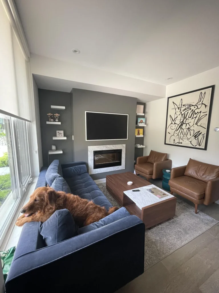 Grey accent walls are having a moment, and when they’re done like this, it’s easy to see why. r/dobbycanhavemysock painted the entire TV wall in a deep charcoal, mounted white floating shelves on either side, and let a few carefully chosen objects — a small trophy, a framed print, a couple of books — do the talking. The result is sleek, modern, and surprisingly calm for such a bold color choice.