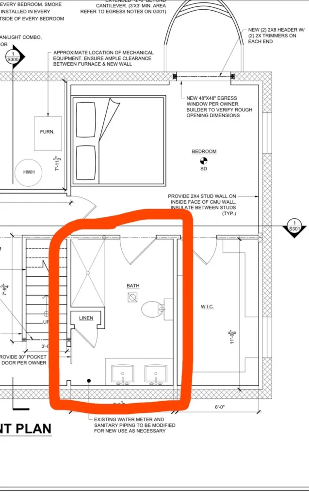 r/Downtown_Highway_282 provides a builder’s perspective with notes about mechanical equipment clearance, egress window requirements, and CMU wall specifications. The bathroom itself features a standard three-fixture layout, but the surrounding context shows how bathrooms fit into larger floor plans. The linen closet sits adjacent to the bathroom, and the detailed annotations indicate this is meant for construction, not just planning.