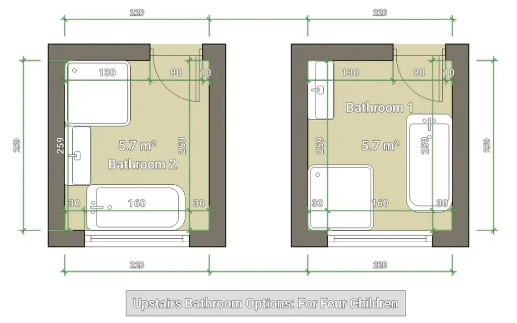 Sometimes you need two identical bathrooms side by side. This plan shows both at 220 by 259 centimeters each, designed for an upstairs serving four children.