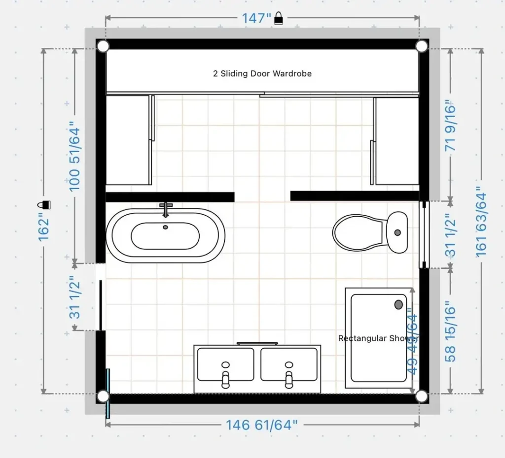 If you’re working with similar dimensions, pay attention to the door placement. Swinging into the vanity or toilet creates daily annoyance. This layout keeps the entry clear while maintaining access to all fixtures.