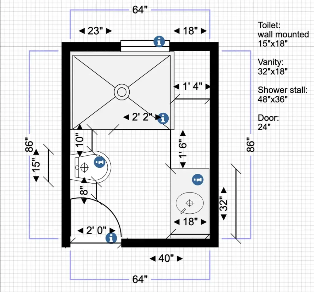 The shower stall occupies 48 by 36 inches in the upper right quadrant. r/sakura3199 detailed every measurement: the wall-mounted toilet at 15 by 18 inches, the 32 by 18 inch vanity, and the 24-inch door. Information icons mark key accessibility features. The plan shows 2-foot clearances where needed and careful attention to turning radius.