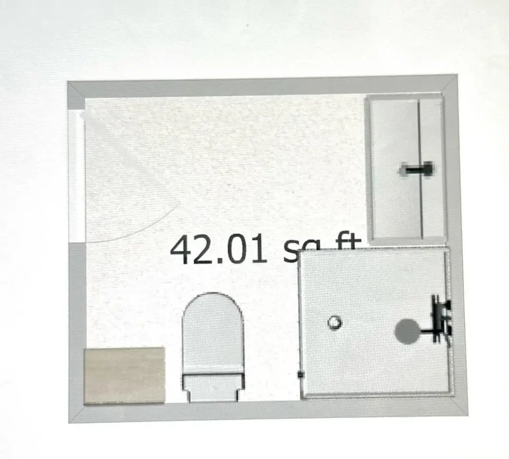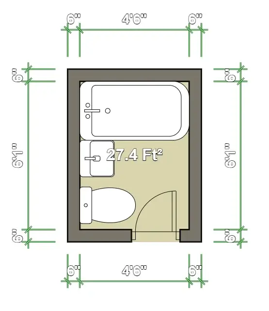 The layout stacks a tub along the top wall, toilet on the left, and sink on the right side. r/Pa4ier shows exact dimensions with the room measuring 4’6″ on each side in the interior space. The fixtures are compact but full-size, proving you don’t need to resort to tiny specialty products.