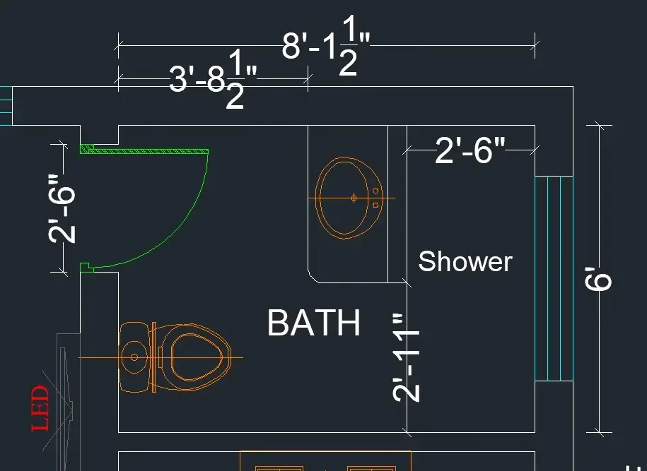 The toilet sits in its own 2-foot-6-inch nook on the left, while the shower takes up a similar space in the top right corner. r/MurderDie centered the main floor space with about 2 feet of clearance in the middle section. The dark background suggests this might be a CAD drawing intended for commercial or multi-family construction.