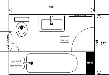 Some bathrooms are more hallway than room. This 90 by 76 inch plan addresses that challenge directly.