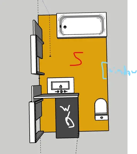 A standard tub spans the width at the top, with the vanity and storage positioned along the left wall. r/jereserd created this design with a bold orange floor space indicating the walking area, and the toilet sits in the lower right corner. The sketch-like quality suggests this might be a preliminary design or quick planning tool.