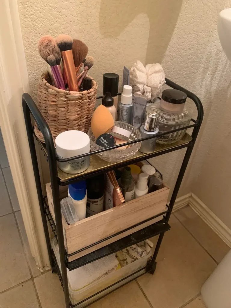 r/paintedskie fitted a black metal multi-tier rolling cart into the corner beside the toilet. The top shelf holds a woven basket crammed with makeup brushes the kind of storage that looks intentional rather than crammed alongside Neutrogena skincare products, a beauty blender sponge resting in a crystal bowl, and a glass perfume bottle.