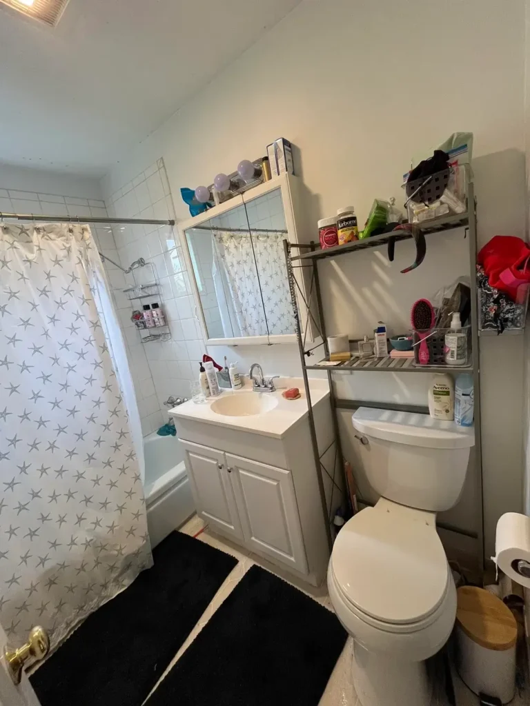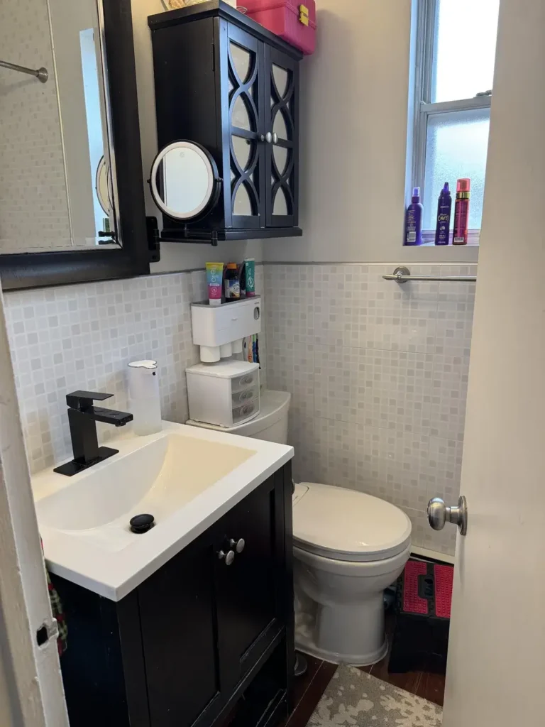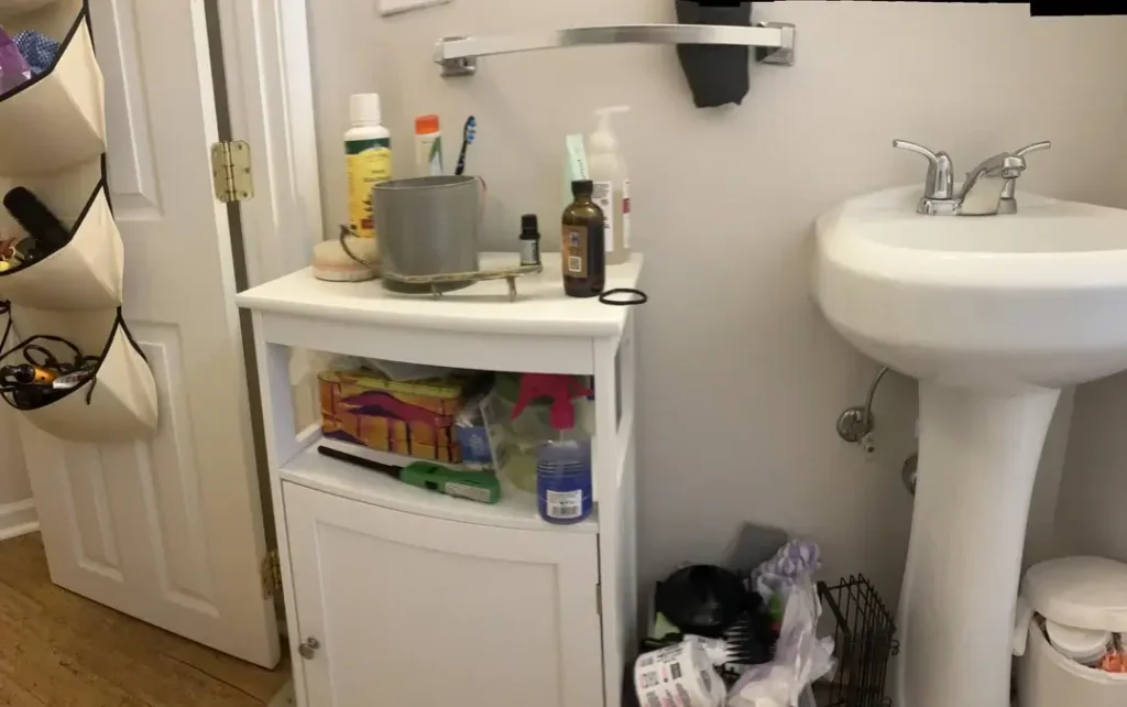 This is honest, functional storage. It is not decorated within an inch of its life, but it is working. The over-door organizer is worth stealing for any bathroom that is genuinely out of options the back of a door is a surprisingly generous amount of vertical real estate that almost everyone ignores.