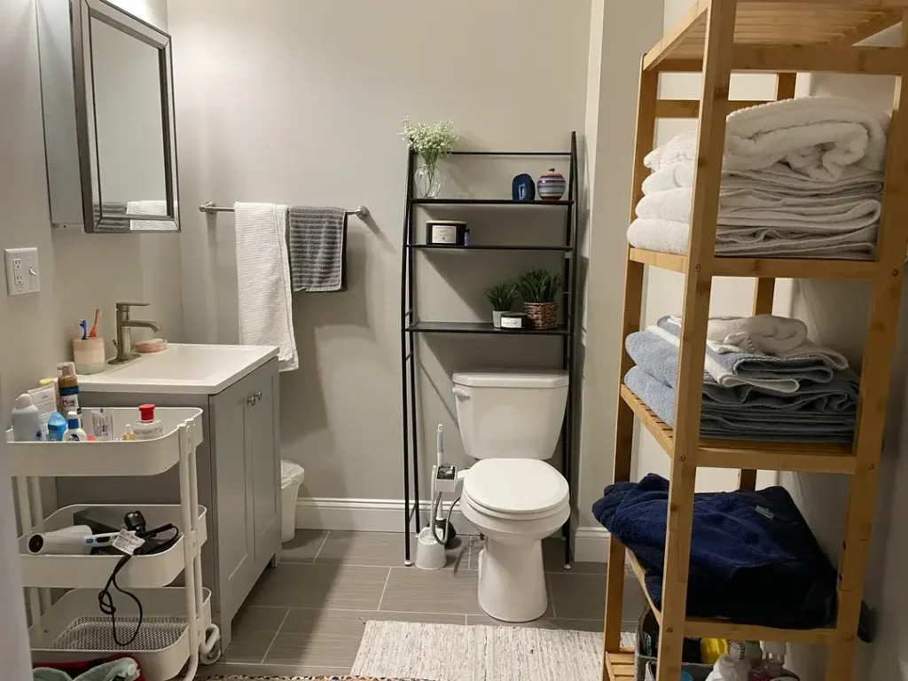 Each tool solves a different problem. The rolling cart handles the stuff you reach for every single day. The over-toilet shelf keeps the toilet area from feeling empty while adding practical storage.