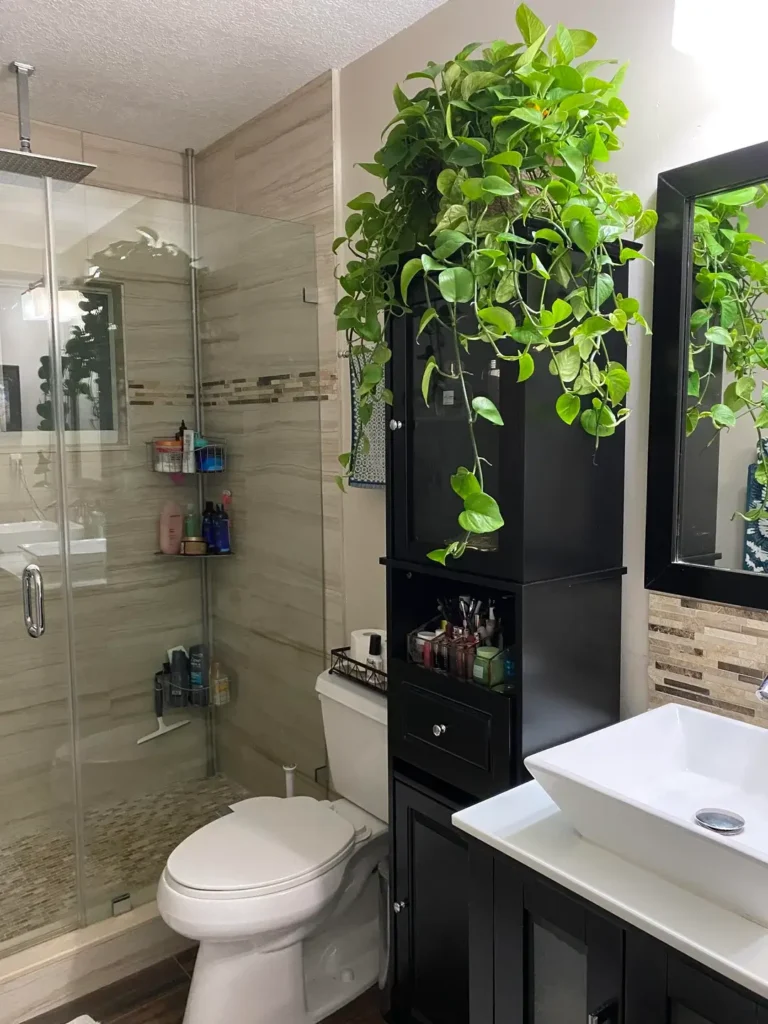 r/CryExotic3558 placed a tall, narrow black cabinet the kind with a glass-front upper section and a closed lower cabinet between the toilet and the vanity.