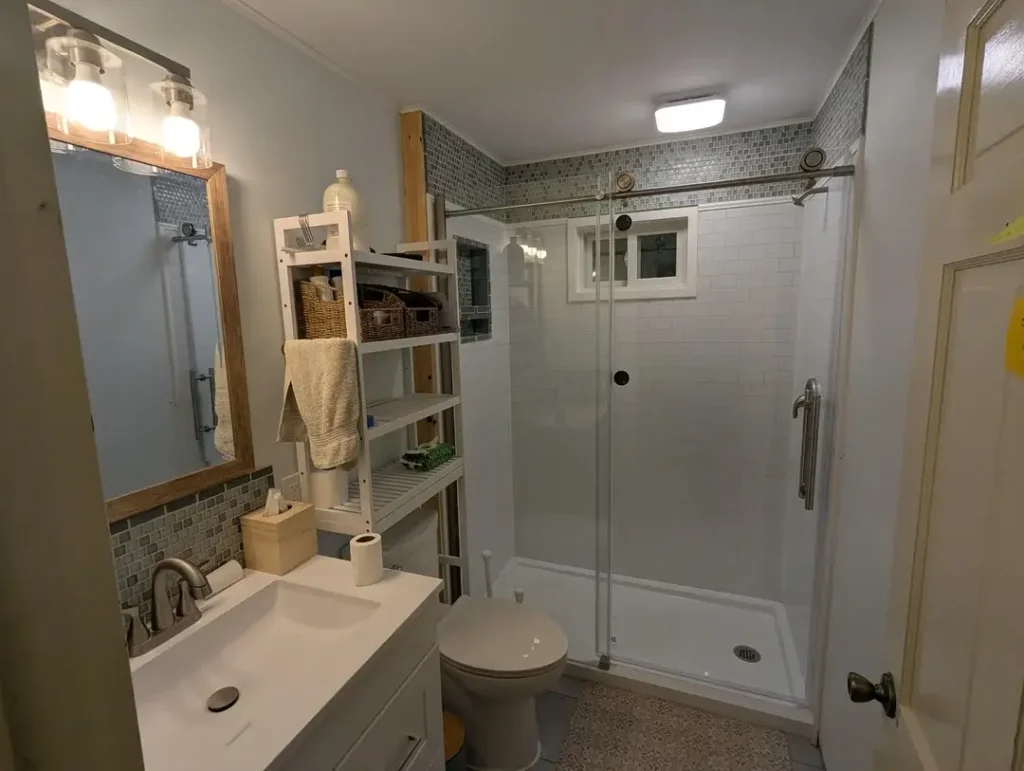 There is almost always a gap between the toilet and the shower that goes completely unused. This bathroom puts a compact white freestanding shelf unit directly in that corridor, and it solves the storage problem without taking a single square foot from the walkable area.