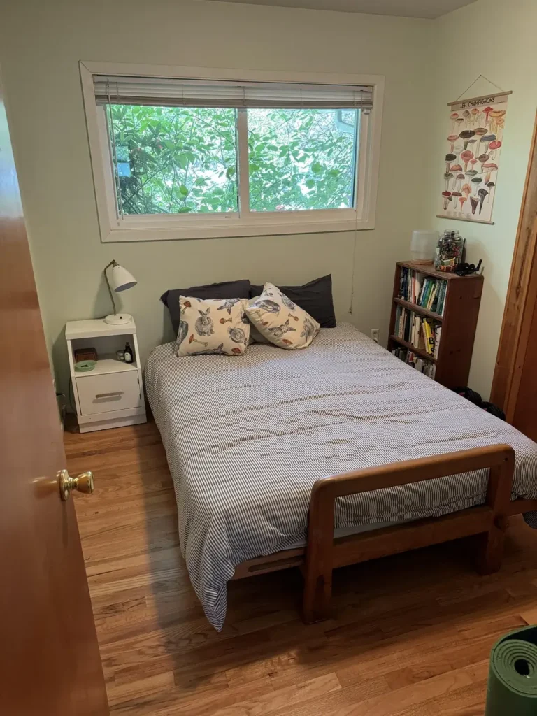 This room keeps the window treatments light with simple horizontal blinds that can be fully raised during the day. r/petitbleu positions the bed to face the window, which creates a natural focal point and ensures morning light reaches the entire room. The simple wood bed frame, white nightstand, and striped bedding all maintain a clean, unfussy aesthetic. The mushroom poster and small bookshelf add personality without demanding attention.