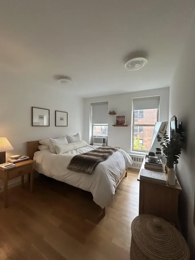This room demonstrates how to build visual interest without color. r/Big-Jackfruit8062 uses all-white and cream bedding but varies the textures: a smooth duvet, a chunky knit throw, crisp pillowcases, and linen shams. The wooden bedside table and leather headboard add warmth, while the two framed prints above the bed create symmetry. The light wood flooring reflects natural light from the windows, and the minimal window treatments keep the room bright.