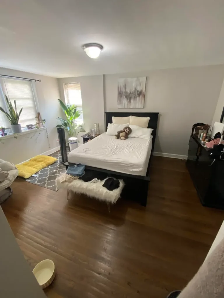 The black bed frame and white bedding create a classic foundation that works in any size space. r/femalelivingspace adds a faux fur bench at the foot of the bed and a textured gray area rug that defines the sleeping zone without requiring permanent installation. The abstract artwork above the bed introduces soft grays and taupes that bridge the black and white extremes. Large tropical plants in the corners bring life to the room without overwhelming it.