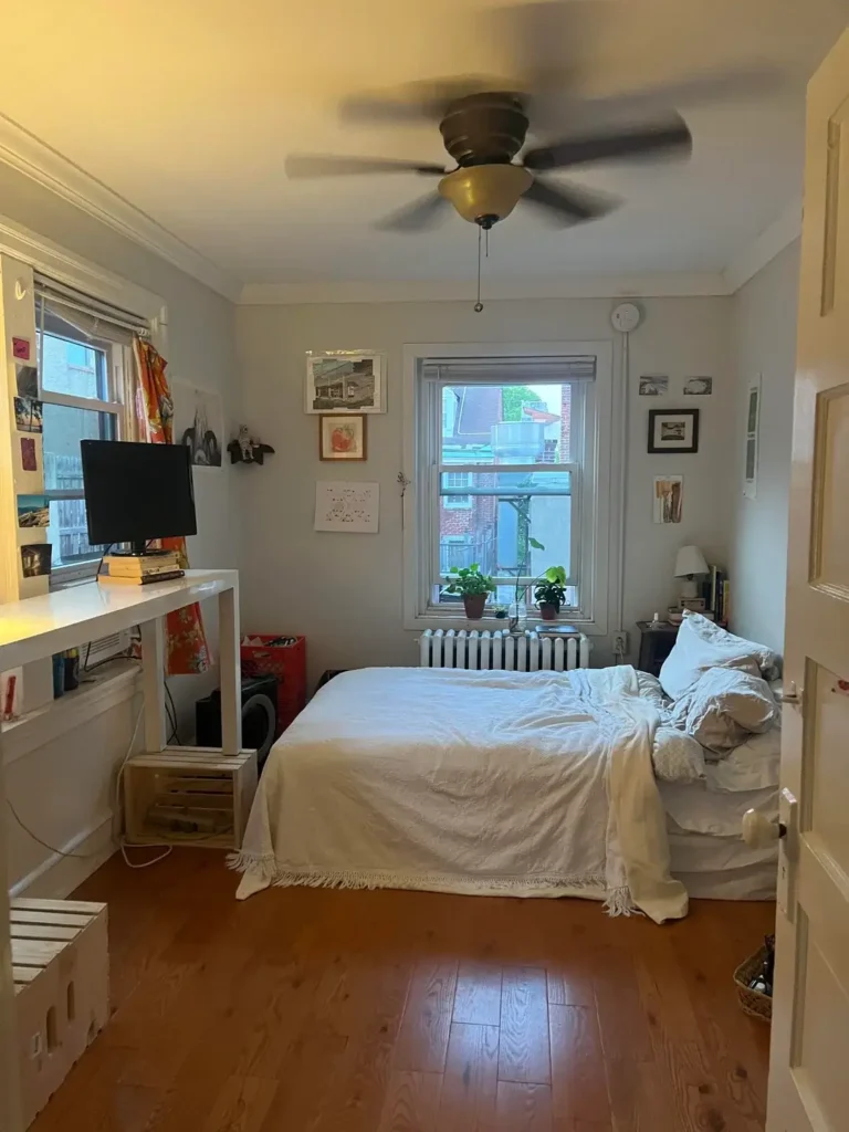 This bedroom finds the balance with an asymmetrical gallery wall that includes framed prints of various sizes, all loosely organized but not rigidly aligned. r/Embarrassed_Gap9200 keeps the frames simple, mostly black or white, which unifies the collection despite the varied subject matter. The bed sits against the wall opposite the window, and the white desk on the left provides workspace without blocking light. Plants on the windowsill bring in natural elements without requiring floor space.