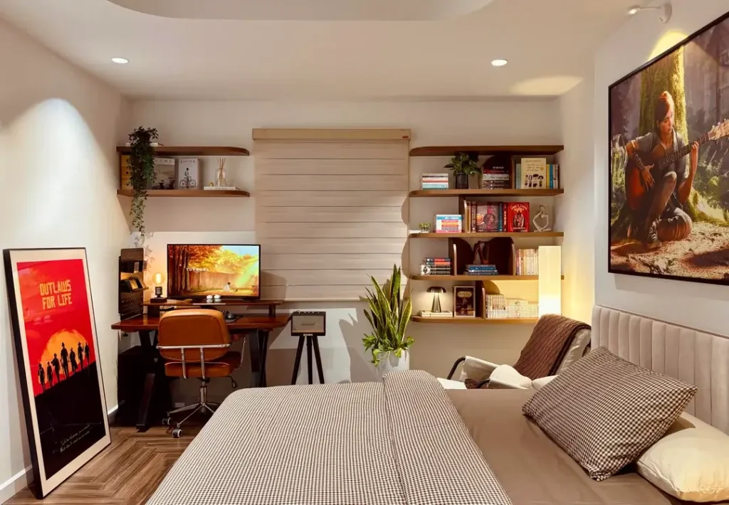 What makes this setup work is the deliberate color palette. White walls, warm wood accents, and neutral bedding keep the room from feeling chaotic despite housing multiple functions. The small pops of color in the artwork and desk accessories add personality without overwhelming the space.