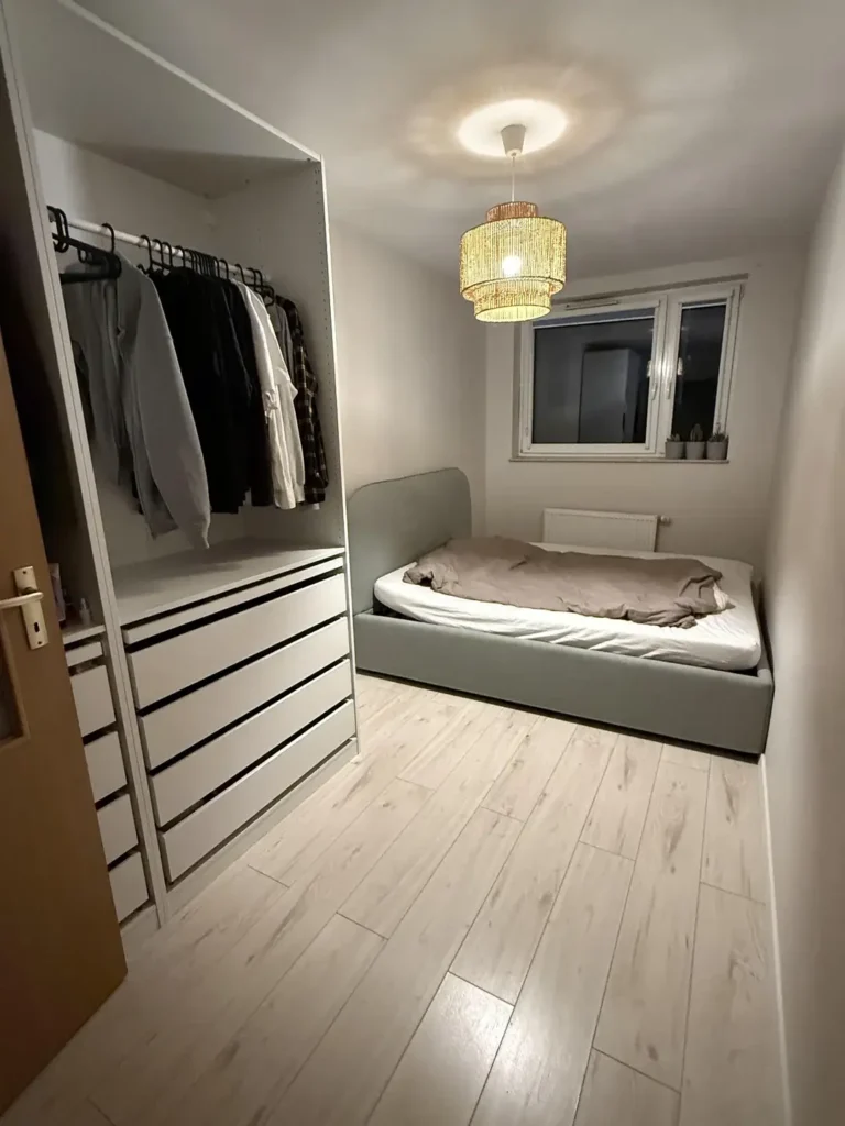 The tiered pendant light in this room immediately catches your attention and pulls your gaze upward, which makes the ceiling feel higher than it is. r/Wonderful_Mixture366 paired this chandelier with light-colored flooring and a minimal white wardrobe system that features clean lines and organized hanging space. The bed sits low to the ground, and the entire color scheme stays within a soft, neutral range.