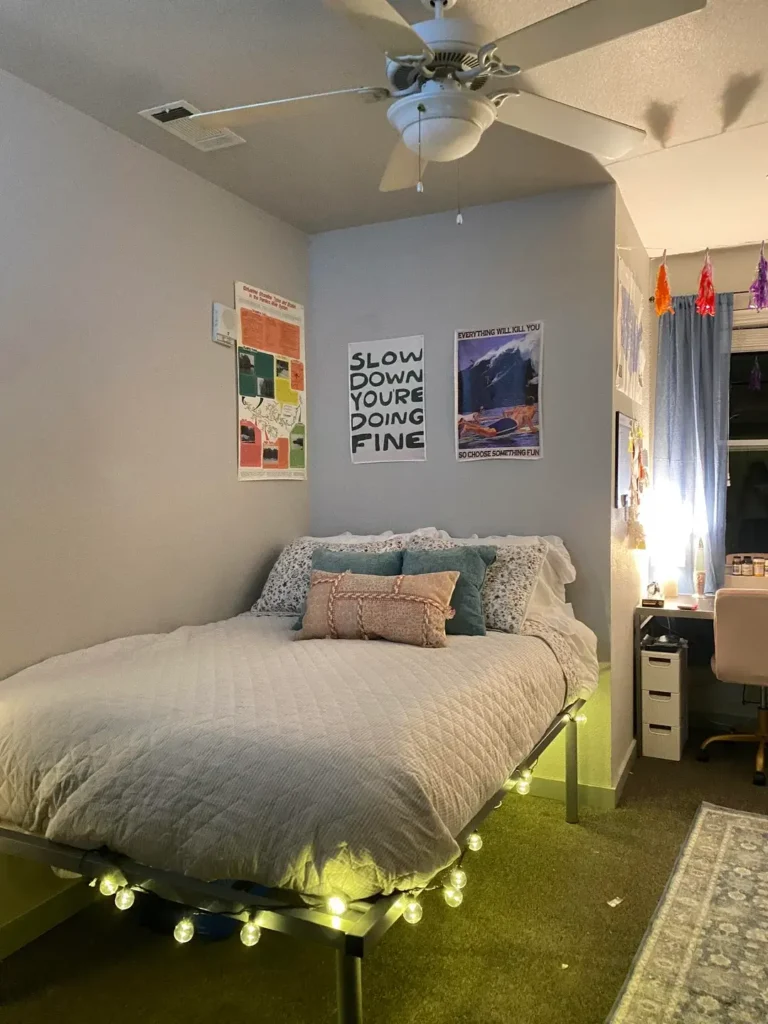 r/rocksandrunning installed warm LED lights underneath the bed frame, creating a floating effect that makes the room feel less grounded and more spacious. The bed sits on a simple metal platform, and the green area rug adds an unexpected pop of color that works because it’s the only bold hue in the room. The gallery wall features motivational posters with strong typography, and the layered bedding in soft grays and creams creates texture without visual weight.