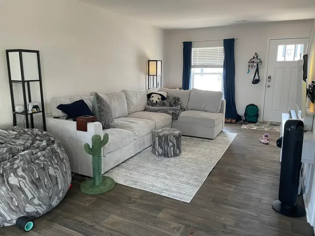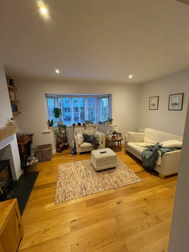 The built-in window seat provides storage underneath while creating an additional seating zone. r/GeorgieH26 kept the main seating minimal with two compact sofas and a square ottoman rather than a traditional coffee table. This arrangement maintains flexibility while preserving walking space.