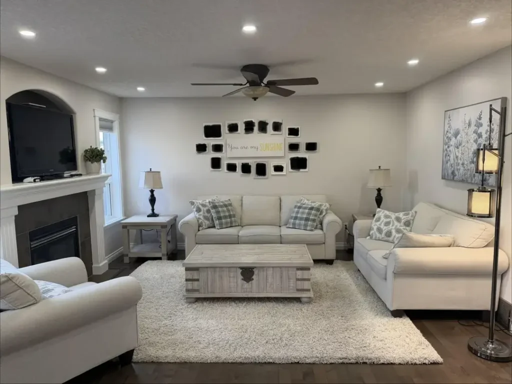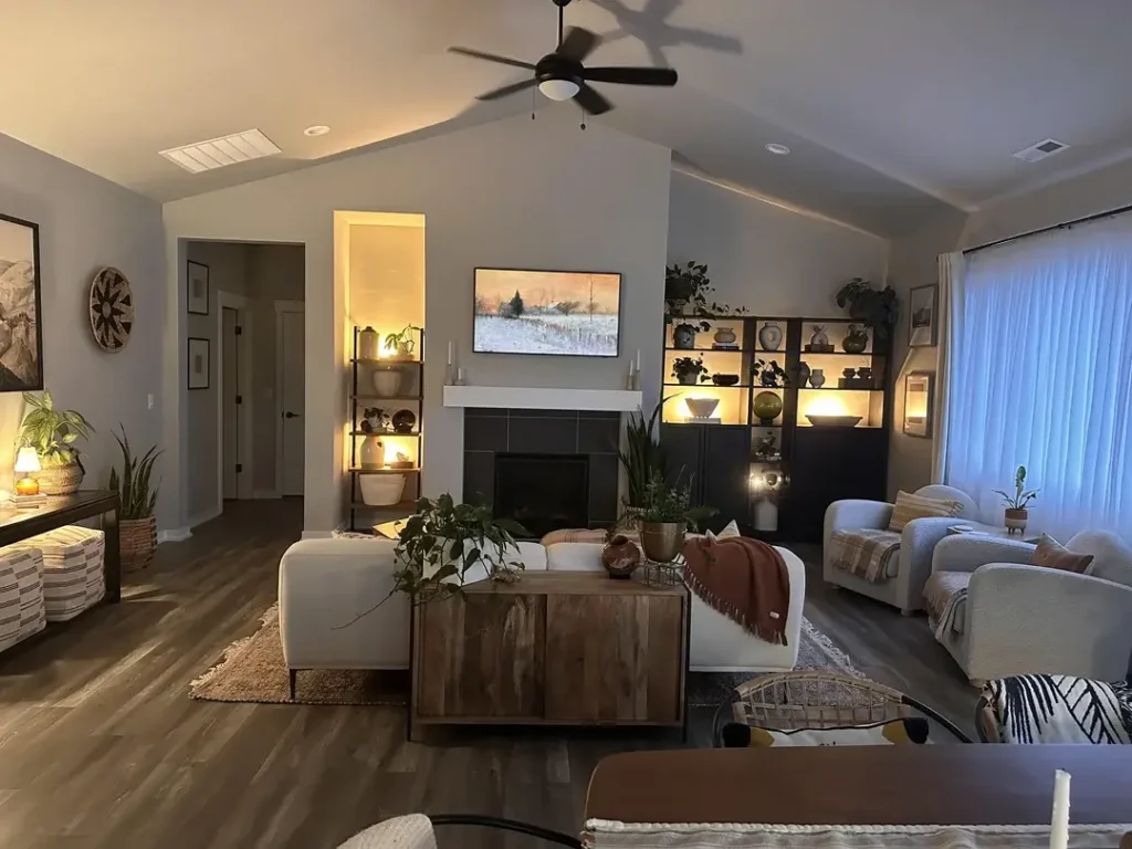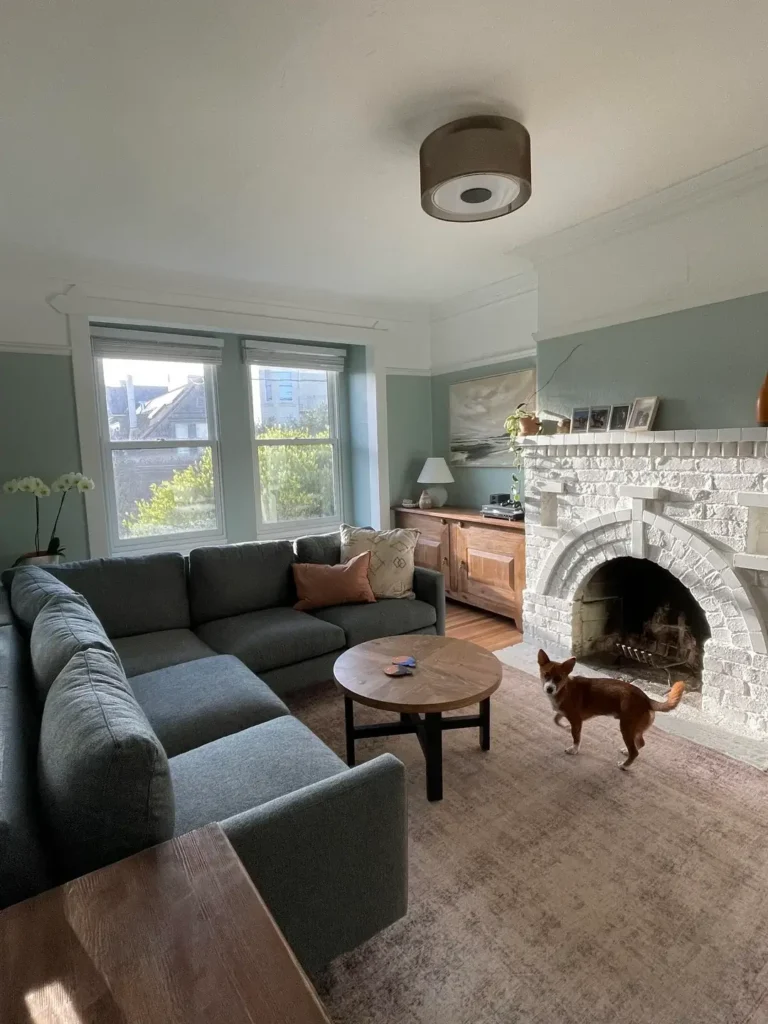 r/mperry381 styled the shelves with a restrained collection of framed photos, small decorative objects, and minimal greenery. The cream seating keeps the focus on the architectural details like the original fireplace and natural wood tones throughout.
