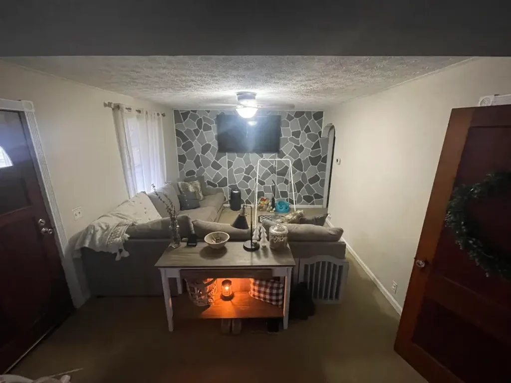 Feature walls work when they create depth rather than just color. The geometric stone accent wall behind the TV draws the eye without making the room feel smaller.
