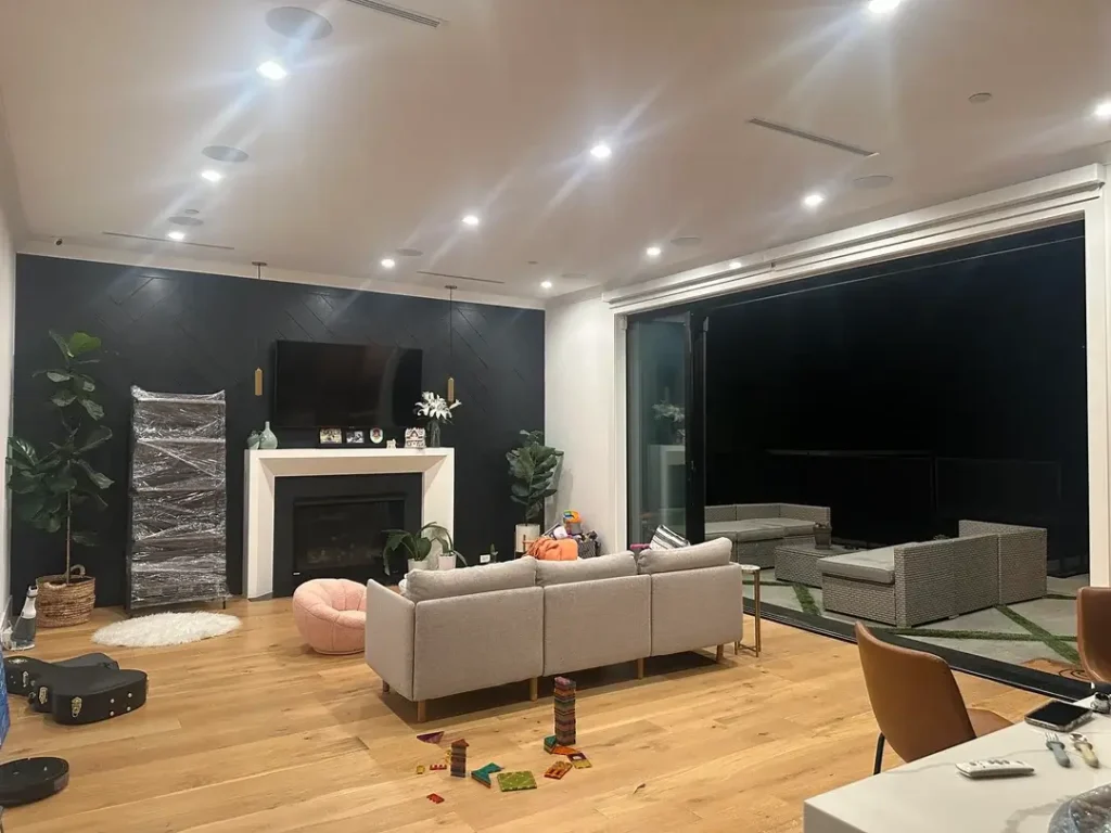 The light oak flooring prevents the dark wall from overwhelming the space. r/MasterCod8007 chose a neutral sectional and area rug that let the architecture speak. The white fireplace surround pops against the dark background, creating a striking contrast.