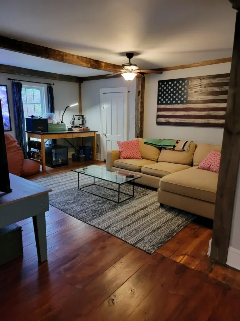 The wooden flag art piece serves as the room’s focal point, providing pattern and personality on an otherwise plain wall. r/DARKTWENTY kept the surrounding walls neutral to let this statement piece shine. The caramel-colored sectional with its modern profile balances the room’s rustic elements with contemporary comfort.