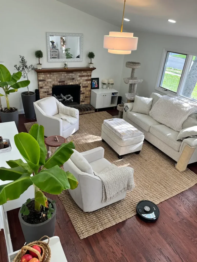 The white brick fireplace provides the farmhouse anchor this room needs, and r/Friendly-View4122 balanced it with a natural wood credenza that adds warmth without competing for attention. The modern drum pendant light proves you can mix eras successfully when you keep the overall palette restrained.