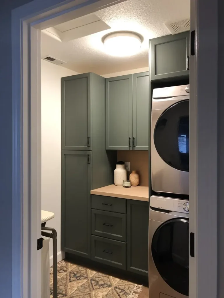 The sage green cabinets r/platofzion installed create a built-in look that makes the stacked machines feel like part of the design rather than an afterthought.