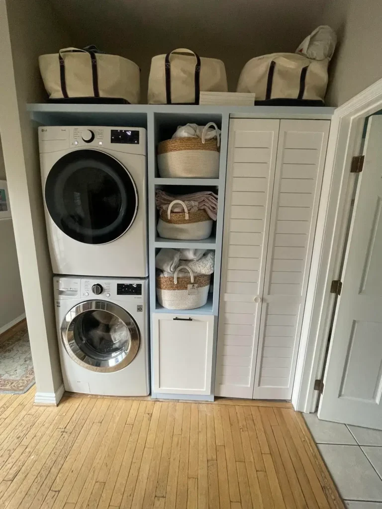 When stacking machines, consider what you’ll need mid-cycle. That middle storage zone should hold things you want during the wash, not just supplies you grab at the start.