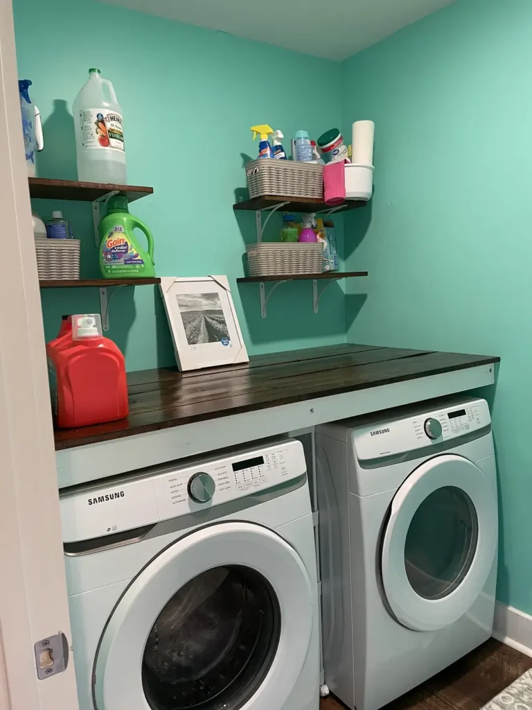 The turquoise walls r/12345665432112345 painted create a cheerful backdrop for those dark wood floating shelves. The same dark wood continues as a countertop over the machines, providing workspace and visual continuity.