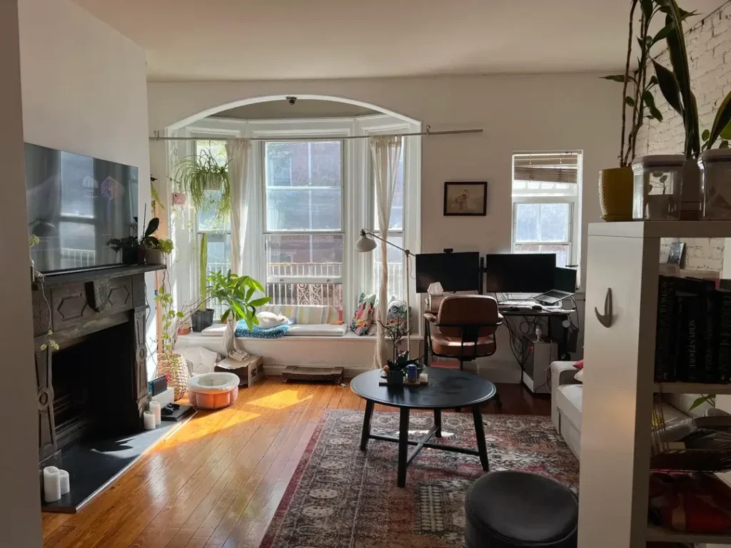 The bay window becomes a dedicated work area with a desk positioned to maximize the natural light and view. r/toothyghost fills the windowsill with plants that thrive in bright conditions, creating a green backdrop for video calls. A round black coffee table anchors the main seating area, which includes a sectional and additional floor seating.