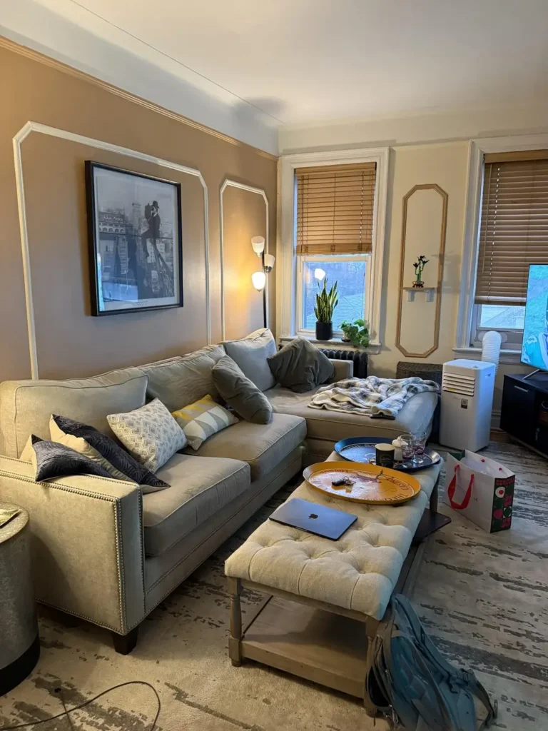 Gold-trimmed white panels frame the walls, creating a sense of architecture that the room likely didn’t have originally. r/Usual_Cell_8847 positions a gray sectional facing a tufted bench that serves as a coffee table. The mix of furniture styles from modern to traditional gives the space personality without feeling like a showroom.