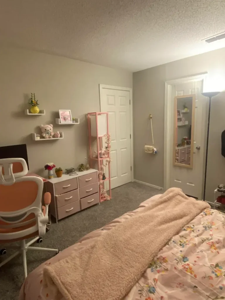 The two white floating shelves provide display and storage space without the visual bulk of a bookcase or dresser. r/Visual_Camera_2341 keeps the coral present in the chair, blanket, and small dresser, but lets the neutral grays and whites dominate the space. The pink full-length mirror adds function while bouncing light around the room.