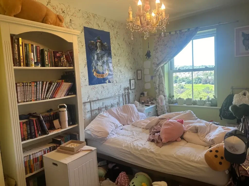 This floral wallpaper features a delicate vine pattern on a light background that actually makes the walls feel less confined. r/yorkshiresmallholder keeps the furniture minimal—a simple metal bed frame and a white bookcase—which allows the wallpaper to be the room’s statement without competing for attention. The Ravenclaw banner and fantasy art prints show personality without requiring additional furniture pieces.