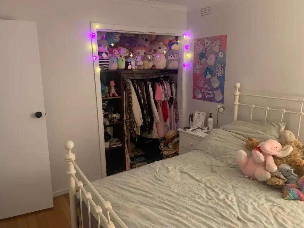 This room eliminates the closet door to create an open wardrobe display framed by string lights. r/emilyyyyxxx turned what could be a messy eyesore into an intentional design element by organizing clothing by type and using the upper shelf for plush toy storage. The LED lights around the closet opening draw your eye to the organization rather than making you focus on the exposed storage.