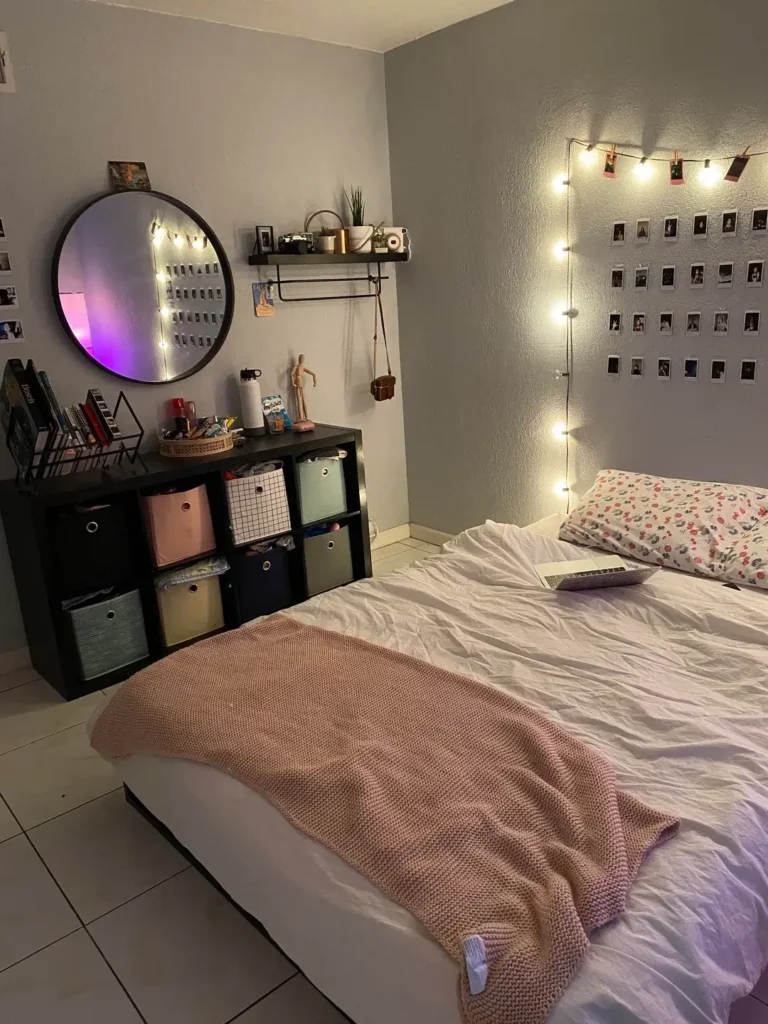The black cube storage unit provides organization without the visual weight of a traditional dresser or bookcase. r/drytugger uses warm string lights as the primary design element, draping them to create visual interest on otherwise bare walls. The round mirror reflects light and creates the illusion of more space, while the photo wall display adds personality without requiring furniture.