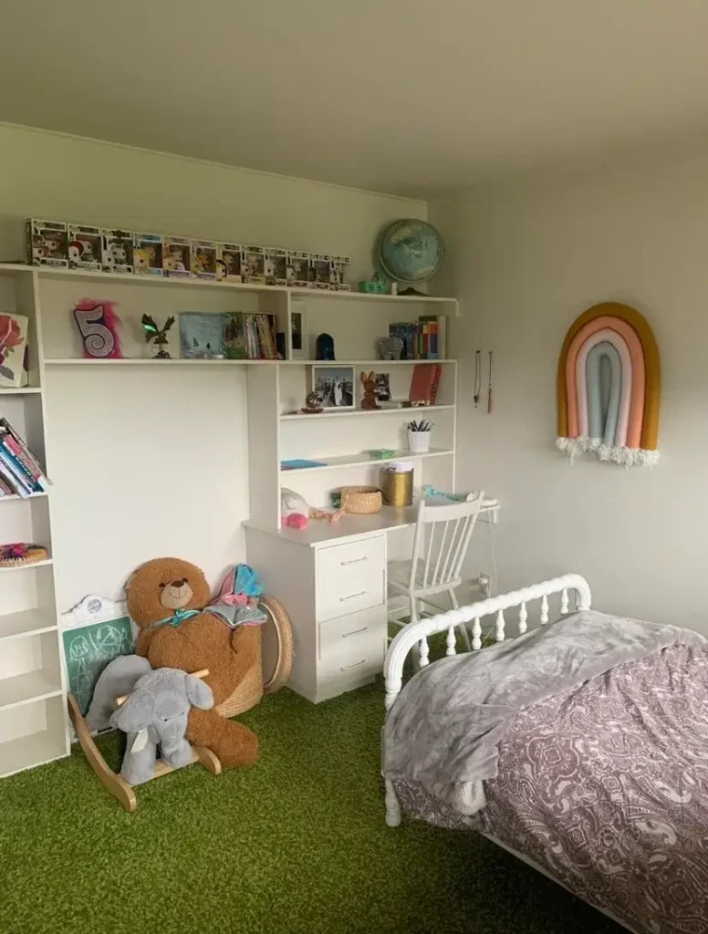 The artificial grass carpet adds texture and color without using wall space or furniture. r/DownRabbitHole01234 pairs it with a white built-in desk and shelving unit that spans most of one wall, providing work surface and display space in a single piece. The rainbow wall art and wicker toy basket introduce organic shapes that soften the room’s clean lines.