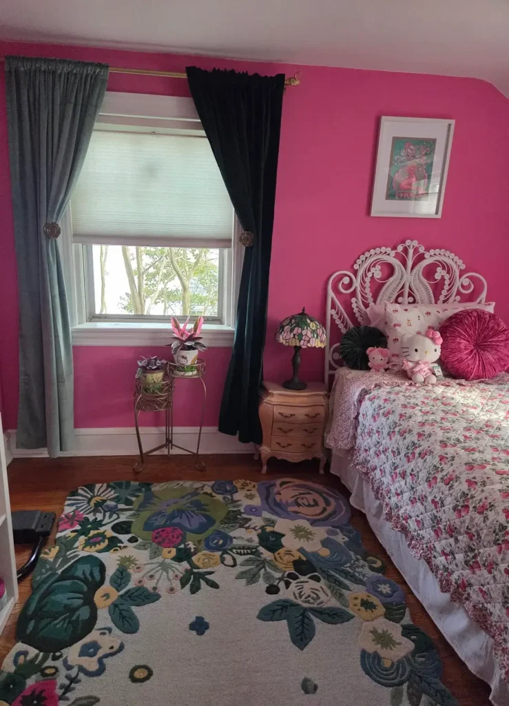 r/lovemypennydog commits fully to a vibrant pink wall color but balances it with substantial vintage pieces that ground the room. The ornate white headboard adds vertical interest without eating up floor space, while the floral botanical rug introduces a completely different color palette that somehow works. Notice the mix of gray and black curtains flanking the window—this creates visual weight that prevents the pink from feeling too sweet.