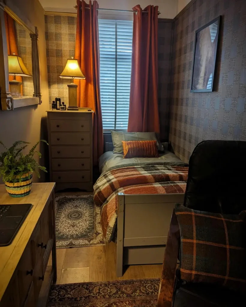 That narrow profile of the bed and dresser matters in a room this compact. Wide, bulky furniture would make the space feel cramped regardless of the lighting choices.
