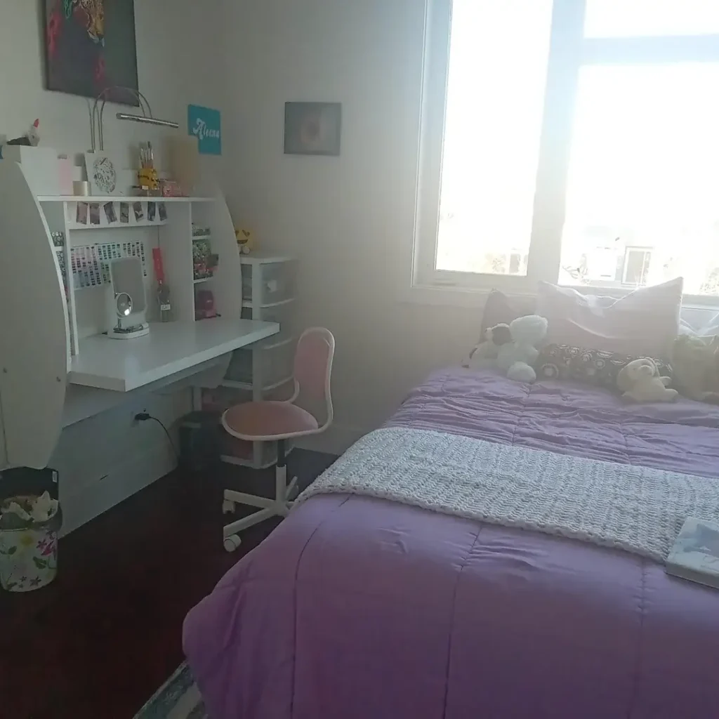 The white desk with hutch storage sits perpendicular to the bed, creating distinct zones within the limited square footage. r/Low-Outside-7070 uses lavender bedding as the room’s color anchor, keeping the walls and furniture white to maximize light reflection. The small rolling desk chair can tuck completely under the desk when not in use.