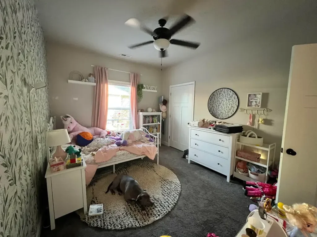 That ceiling fan is black rather than white, which grounds the room and prevents it from floating away in lightness. The pink curtains and stuffed animals introduce soft color without fighting the green wallpaper.