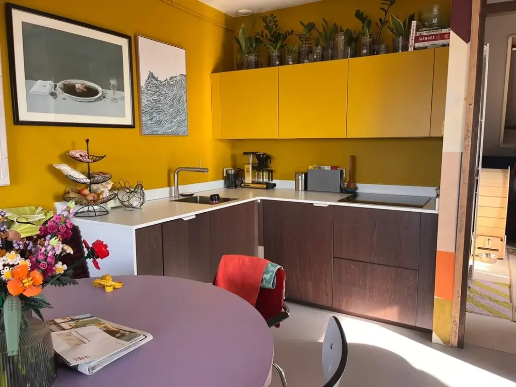 r/jipver painted the kitchen walls a saturated golden mustard yellow and didn’t stop there. Two framed pieces hang on that yellow expanse: a large black-framed photorealistic work and a smaller abstract line-drawing print in a simple white frame.
