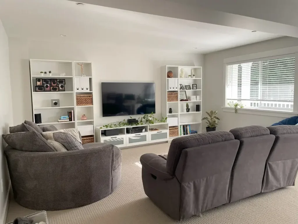 r/PetesHa flanked a large television with two tall white shelving units that run nearly floor to ceiling, creating a built-in media wall effect without any actual construction.