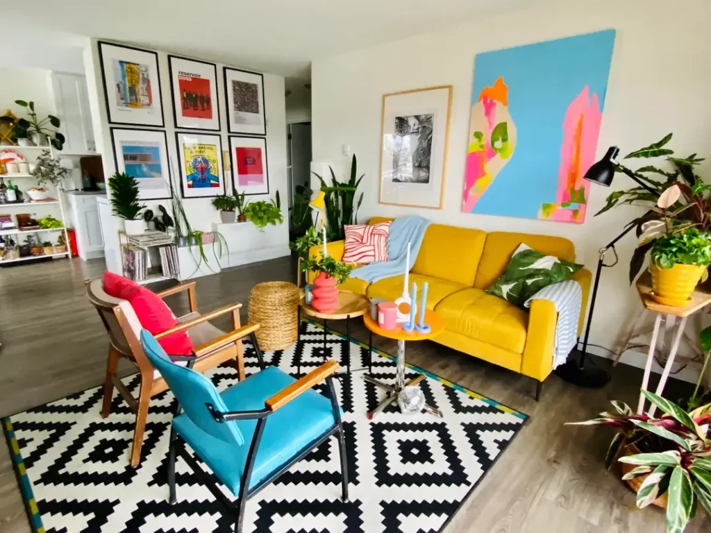 r/sylviatrench01 pulls off an energetic, art-forward living room by grounding the entire space in a strong chromatic logic.