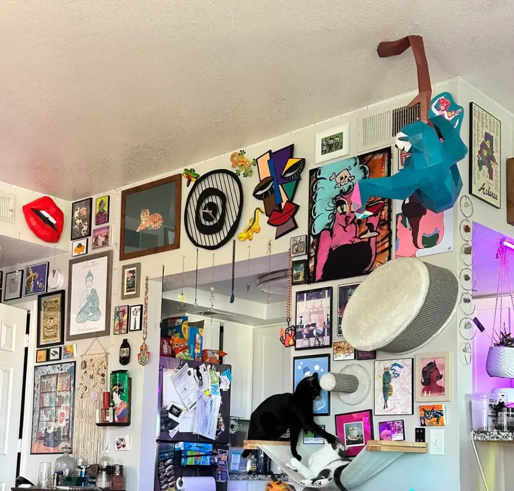 The collection includes framed prints, a bold red 3D lip sculpture, a circular black metal wall piece, a teal geometric animal figure mounted near the ceiling, colorful pop-art panels, a macramé hanging, and what appears to be an Atlanta city print in the corner. Two cats oversee the whole operation from a mounted cat shelf, which honestly fits perfectly.
