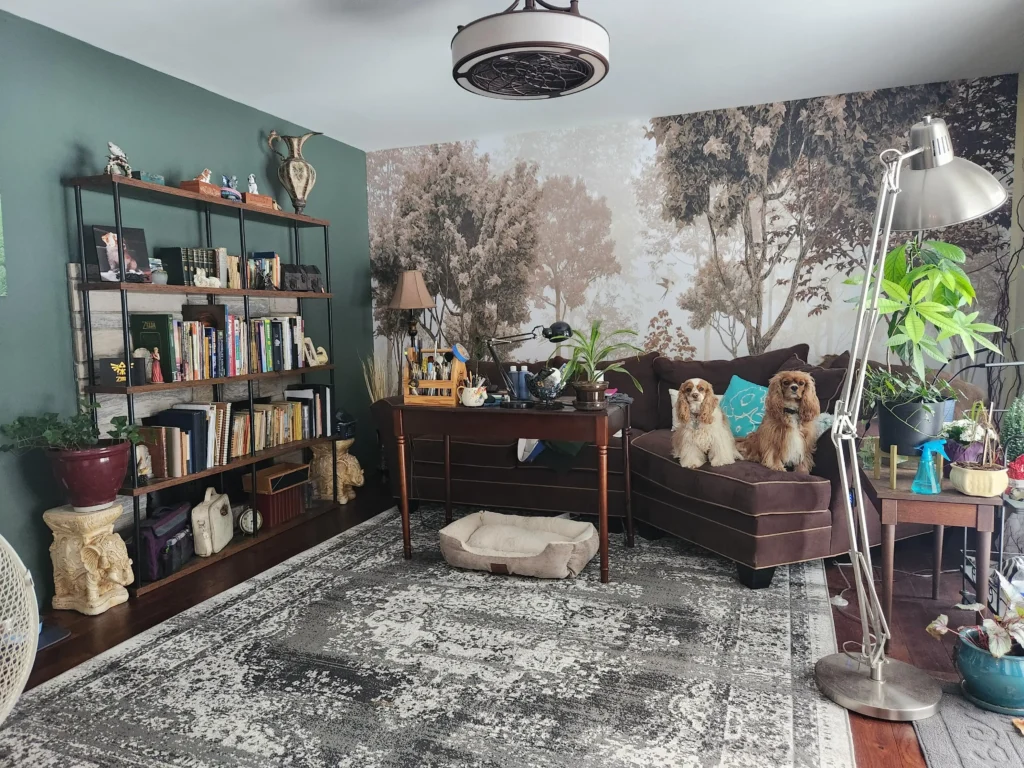 The combination of the painted wall color with the mural creates a layered forest effect that’s surprisingly immersive.