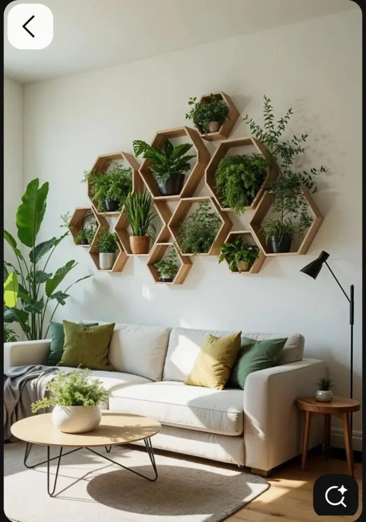 r/Competitive-Ad4941 installed a cluster of natural wood hexagonal shelves in varying sizes across a white wall above a light gray sofa, filling each compartment with a different potted plant.